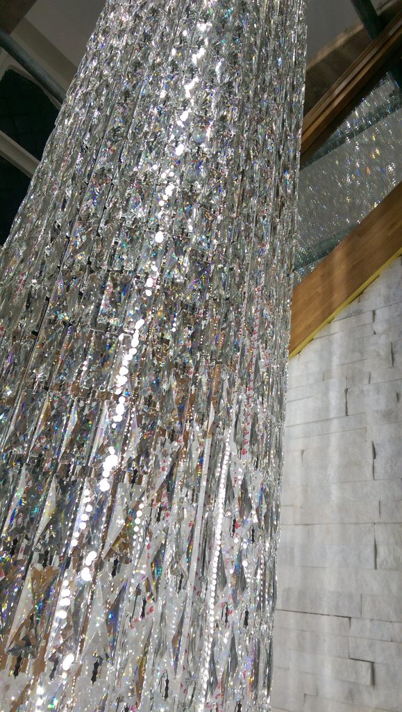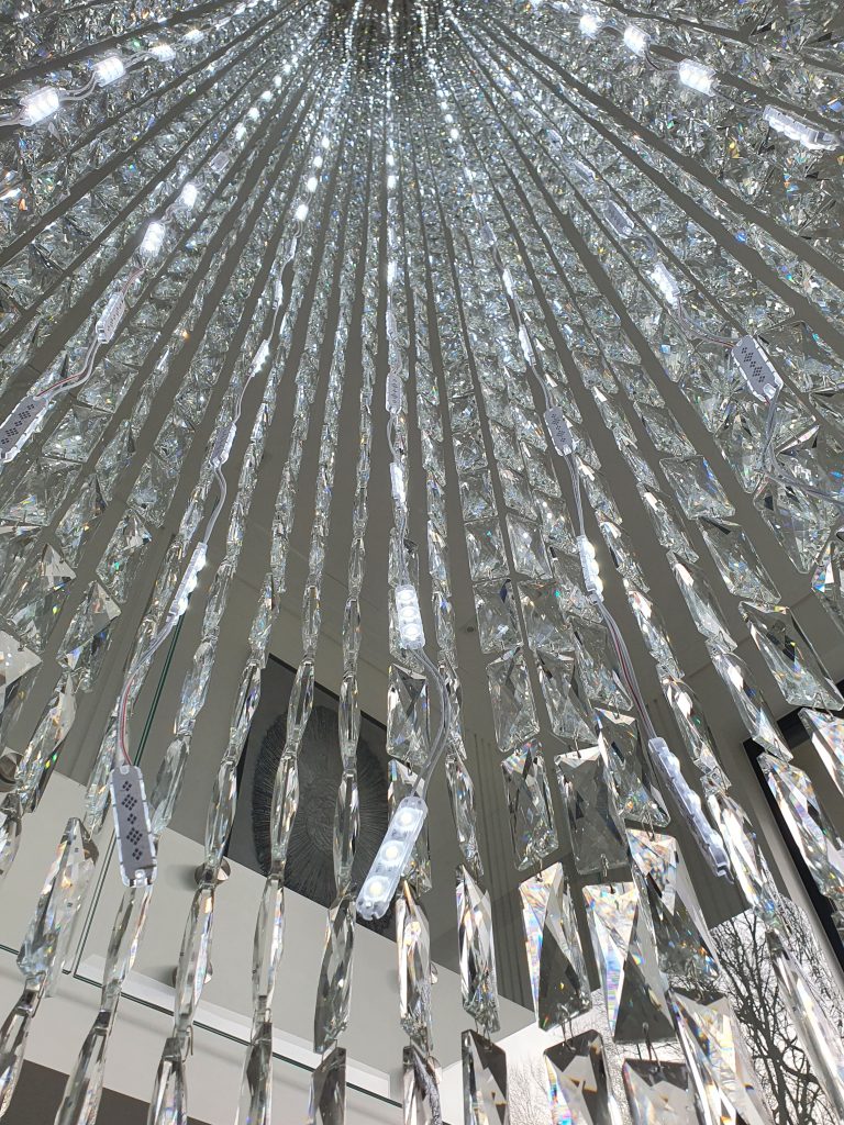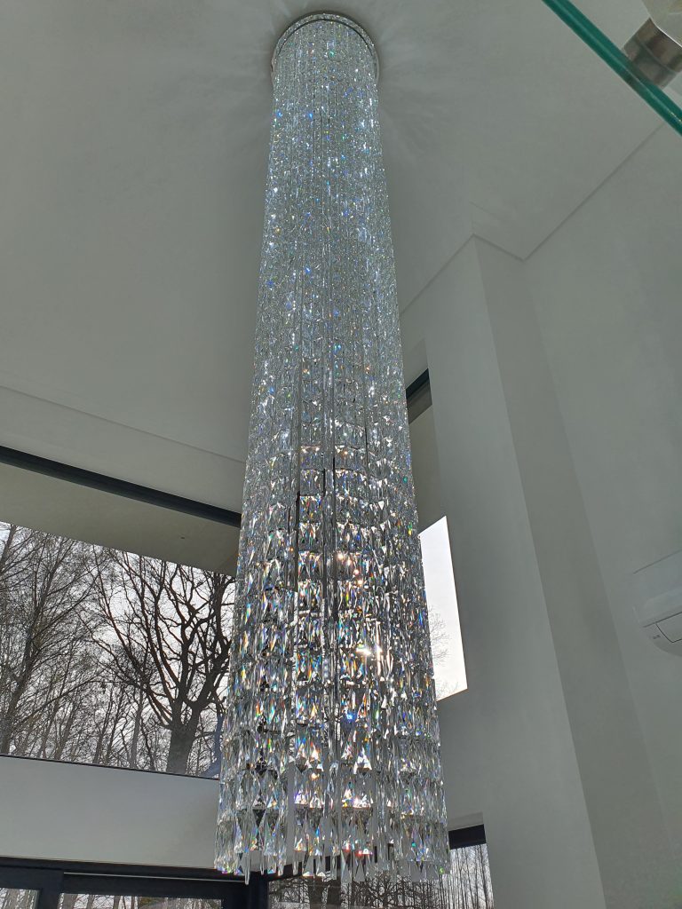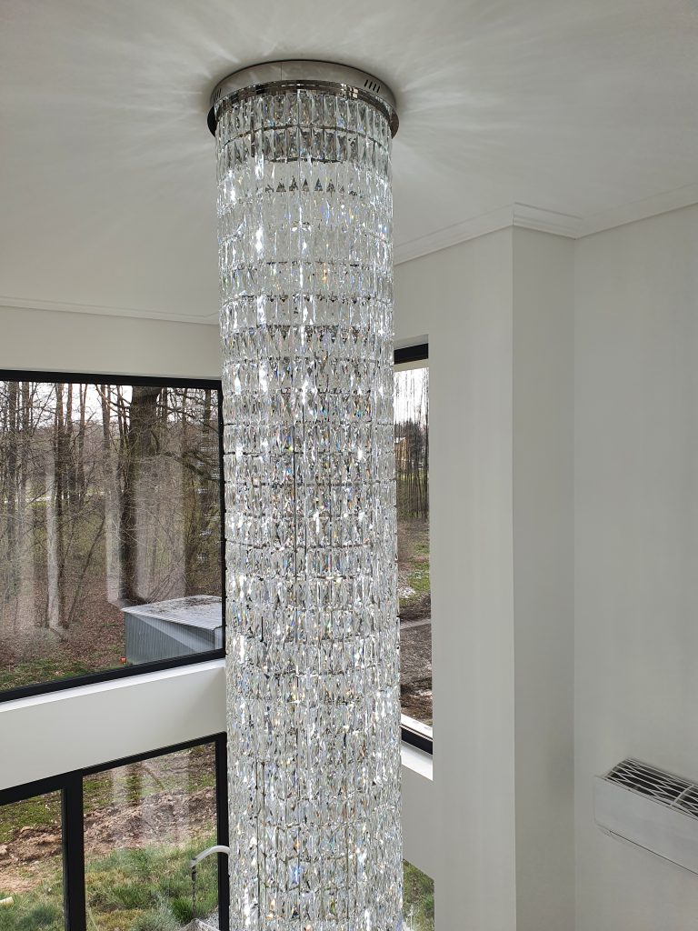 Klienci szukali lampy, która zagospodarowałaby miejsce w strefie dziennej nowego domu. Spośród przedstawionych propozycji wybrali lampę kryształową o indeksie 15788 z kolekcji lamp Casa Regal. Ze względu na otwarty typ pomieszczenia, wysoki sufit oraz bliskość okna Casa Regal zaproponowała lampę na plafonie o średnicy 55 cm i długości 350 cm. Na chromowej, błyszczącej plafonierze zostały zamontowane sznury kryształów w kształcie sztabek, które w ciągu dnia rozpraszają świtało słoneczne wpadające do pomieszczenia. Lampa pełni nie tylko funkcję ozdobną ale także ma za zdanie doświetlić zastaną przestrzeń. Dlatego też na całej długości lampy zostały zamontowane specjalne taśmy ledowe, które nie tylko podkreślają piękno użytego w lampie kryształu ale także spełniają oczekiwania Klienta co do funkcjonalności zamówionej lampy. W prezentowanym modelu użyto taśm ledowych o barwie neutralnej, które podkreślają nowoczesny charakter wnętrza. Całość doskonale współgra z oszczędną kolorystyką przestrzeni i przeszkleniem schodów.